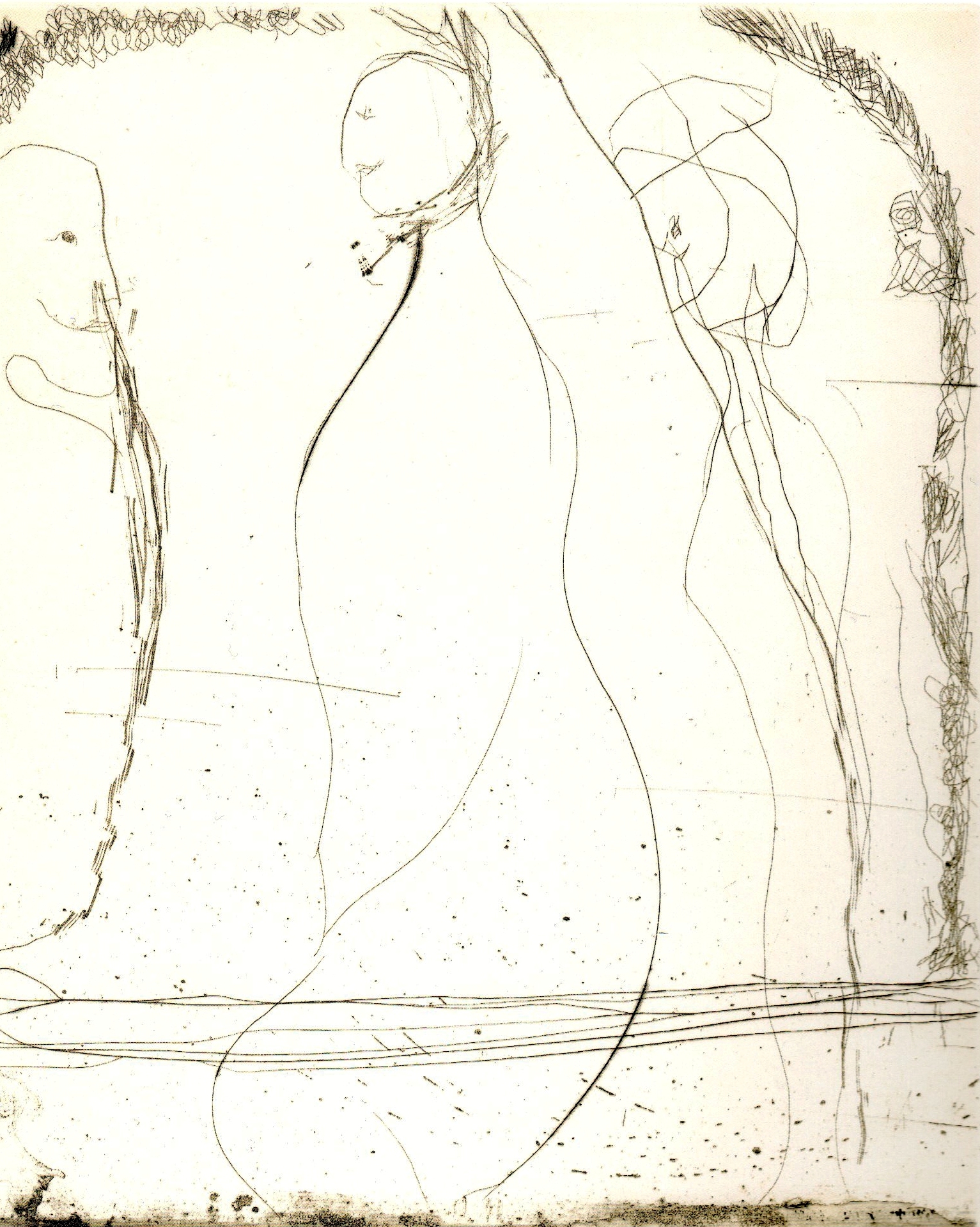 Und groß war die Versuchung für den erfindungsreichen Verfertiger subtiler Steindrucke, zarter Steinritzungen, farbiger Holzschnitte ın schwebenden Klängen, den Verlockungen der geätzten Radierung, den Reizen der samtigen Aquatinta zu erliegen. Doch nein: nicht an der Vertiefung seiner verflochtenen Farbteppiche in metallene Druckplatten lag ihm; vielmehr sah er die Chance, seine Lust an der Linie auf die Spitze zu treiben. Der Radierung mit der „kalten Nadel“ gehörte seine schnelle, instinktive Zuneigung. Die unmittelbare Zeichnung, spontan und konzentriert, mit Radiernadel, Schere, Messer oder Nagel in die metallene Platte zu ritzen, zu reißen, ohne jede Möglichkeit einer Korrektur: im angespannten, kraftvollen Zugriff oder sanft ausgleitend. Linien wie auf der Geige gespielt: schroff, scharf, gratig und dann wieder in sußen Kantilenen verwehend.